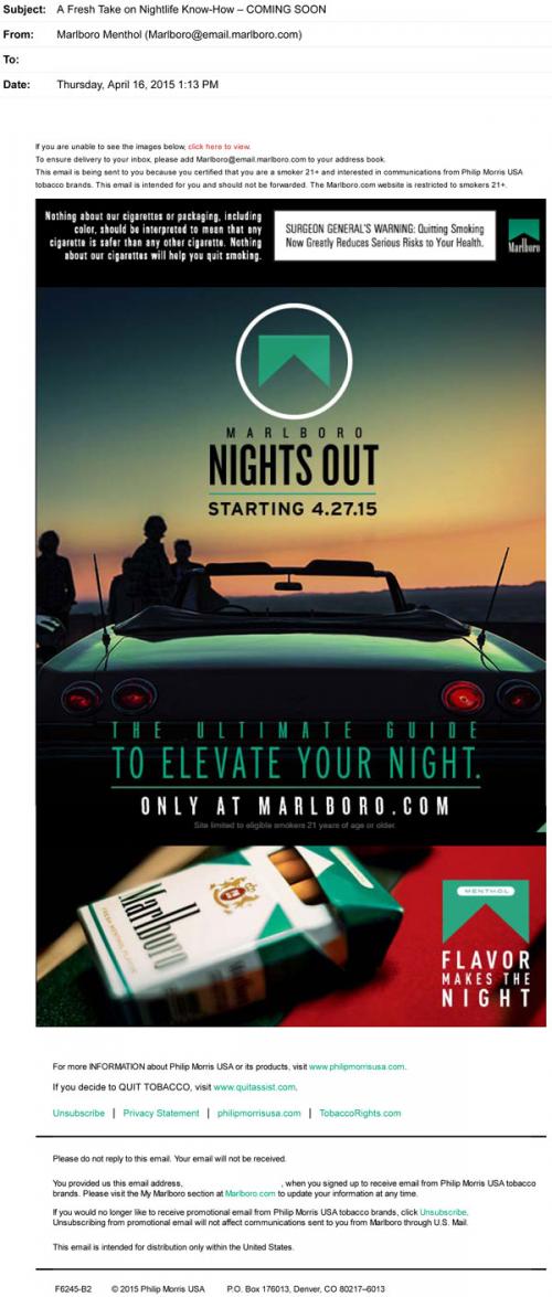 Email announcing the start of Marlboro Nights Out on April 27, 2015, "The ultimate guide to elevate your night."