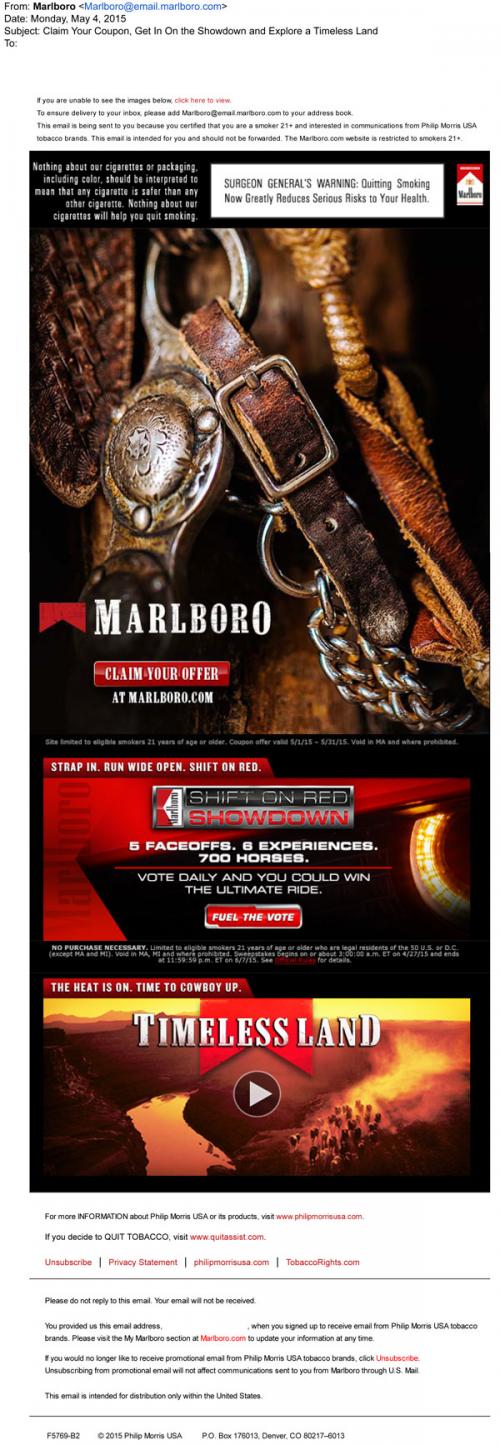Marlboro email from May 2015 inviting the recipient to claim a coupon at the brand website, participate in the Shift On Red Showdown sweepstakes, and watch a Timeless Land video.