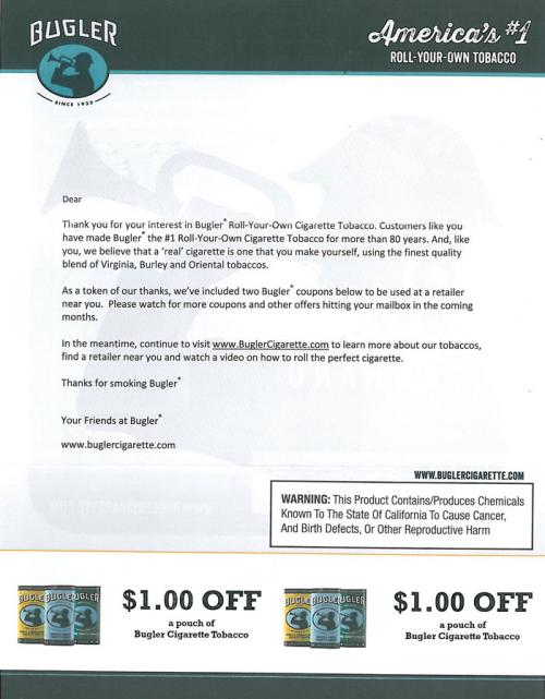 Direct mail from Bugler received in May 2015 in the style of a personal letter to the receiver. The letter thanks the receiver for their interest in Bugler and delivers two coupons for $1 off a pouch of Bugler Cigarette Tobacco. The piece also invites the recipient back to the brand website to watch a video on how to roll the perfect cigarette.