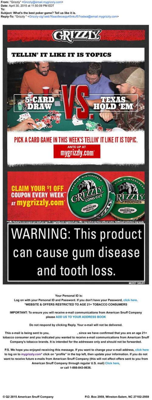 Email from Grizzly in April 2015 inviting the recipient to the brand website to vote on their favorite poker game in this week's "Tellin' it like it is" discussion topic; also includes a reminder to claim a weekly coupon.