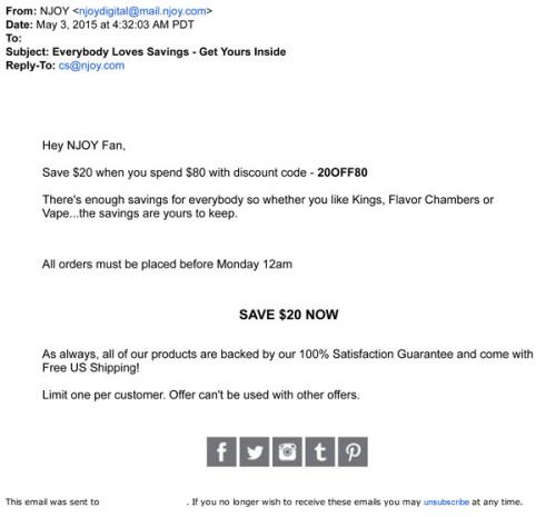 Njoy discount code via email in May 2015 with an offer for 20$ off an 80$ purchase on the brand website. Text: "The savings are yours to keep."