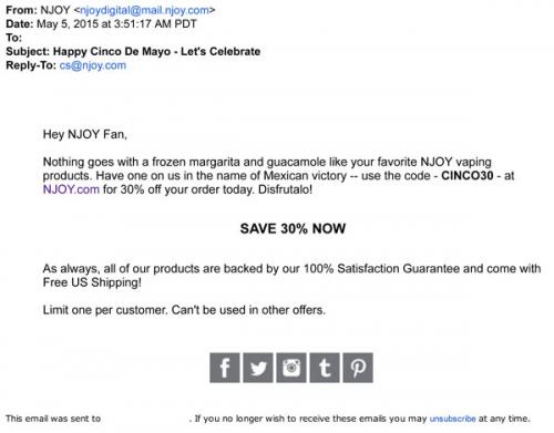 Njoy with a discount offer for Cinco de Mayo to "Have one on us in the name of Mexican victory." Text: "Nothing goes with a frozen margarita and guacamole like your favorite NJOY vaping products."