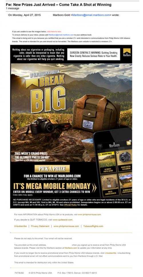 Email update from Marlboro received at the end of April 2015 about the Break Big sweepstakes, reminding the recipient to enter daily for their chance to win the prizes featured in the image. The email also reminds recipient that it is Mega Mobile Monday, where players can get 3 extra chances to win when they visit the brand website via their mobile phones.