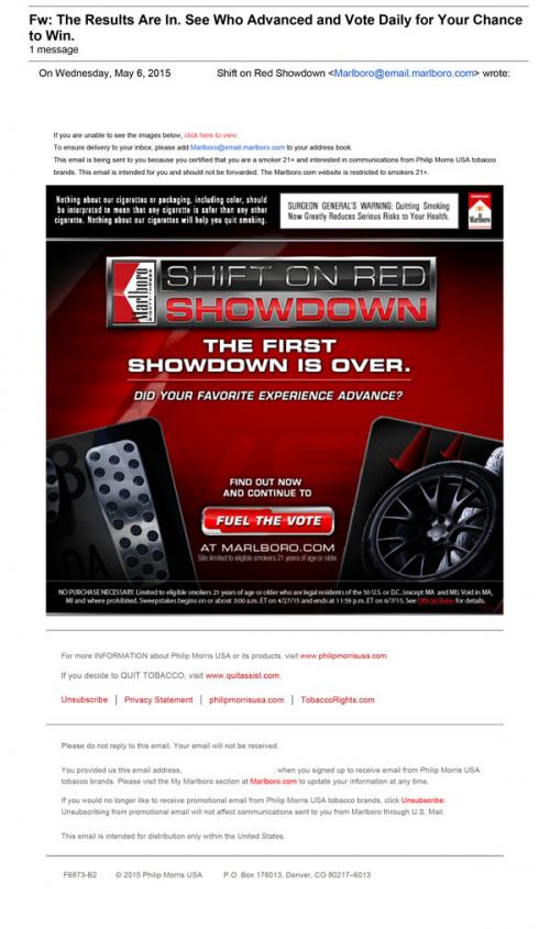 Email received in May 2015 promoting Marlboro's Shift on Red Showdown. The email invites the recipient to the brand website to see if their selection won in this weeks showdown and also to continue to enter daily for a chance to win. Text: "The first showdown is over. Did your favorite experience advance? Find out how and continue to fuel the vote at Marlboro.com"