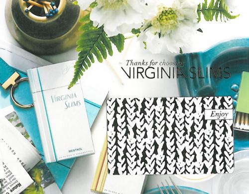 Direct mail received from Virginia Slims December 2014 in DC. The piece contains 2 coupons for $3 off a cartoon. It also directs the received to the brand website for more fashion, conversation and monthly coupons. Text: "Virginia Slims. Fabulous. True. You"