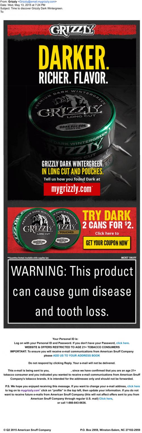 Grizzly email in May 2015 promoting their Dark Wintergreen product. Invites the recipient to the brand website to comment on what they think of the product, as well as get a coupon.