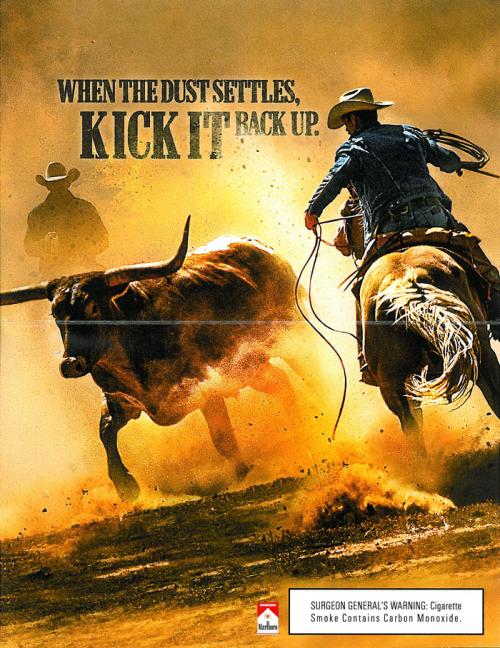 Direct mailing from Marlboro in January 2015 delivering coupons. Imagery includes a closeup of a cowboy smoking and cowboys roping a steer. A bonus flyer promotes the brand website and the Five Card Draw game, with a QR code to access it via mobile phone. Text: "When the dust settles, kick it back up."