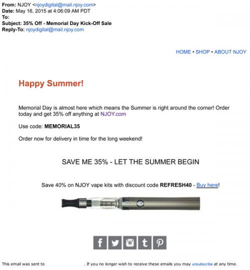 NJOY promotes a Memorial Day Kick-Off Sale in an email from May 2015. Customers with the coupon code can get 35% off at the brand