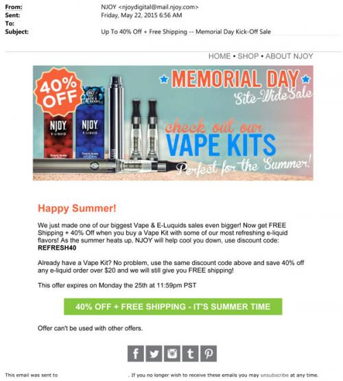 NJOY promotional email as a kickoff to Memorial Day weekend in May 2015, featuring a sale on their vape and e-liquid products.