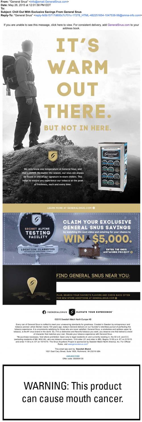 Email from General Snus in May 2015 promoting their chilled smokeless products, from their "signature in-store chillers." Invites the recipient to the brand website to enter a sweepstakes for the chance to win 5,000$ and includes the locations of nearby retail stores. Text: "It's warm out there. But not in here."