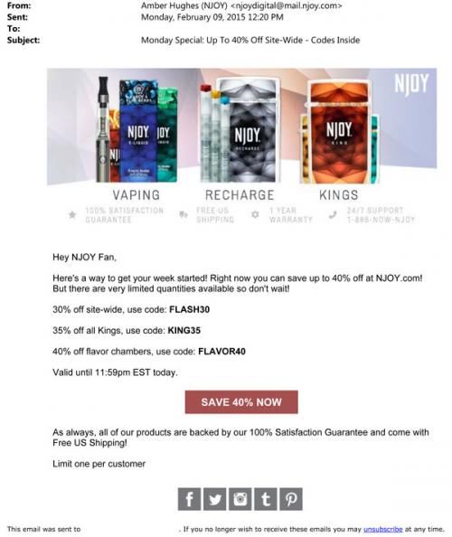 NJOY email in February 2015 with some Monday Special discount codes for use by customers on the brand website. Text: "Here's a way to get your week started!"