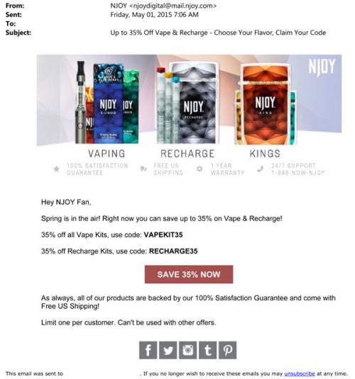An email from NJOY with Friday discount codes in May 2015, for use on the brand website. Text: "Spring is in the air!"