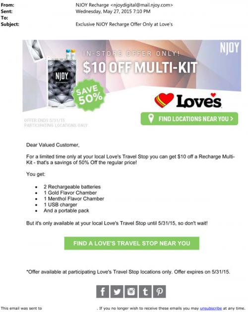 NJOY promotional email sent in May 2015 about a limited time discount on Recharge MultiKits, only at a store chain called Love's Travel Stop. Customers could save 50% off the regular price.