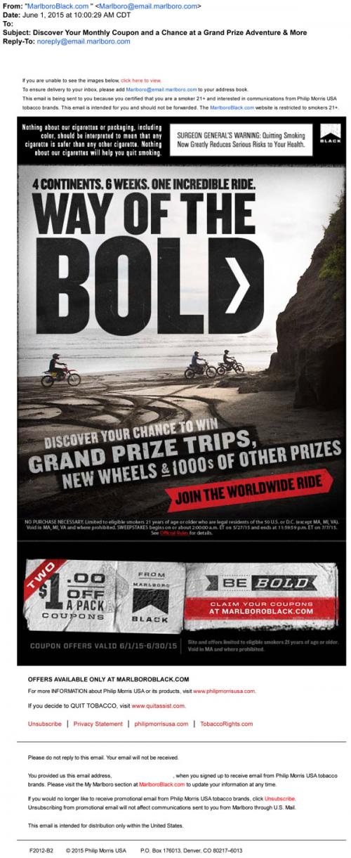 Email from Marlboro in June 2015 promoting their Way of the Bold sweepstakes. Also invites the recipient to the brand website to claim Marlboro Black coupons.