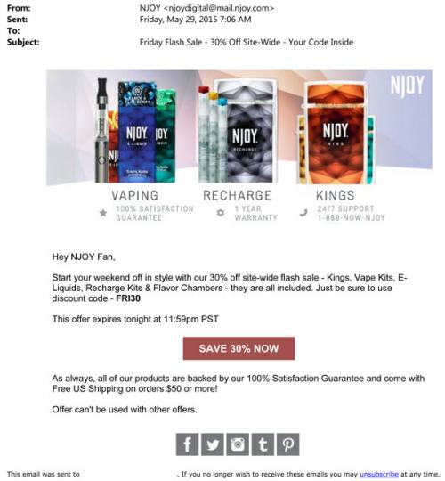 Email from NJOY in May 2015 promoting a Friday flash sale discount code that the recipient can use at the brand website for 30% off their purchase.