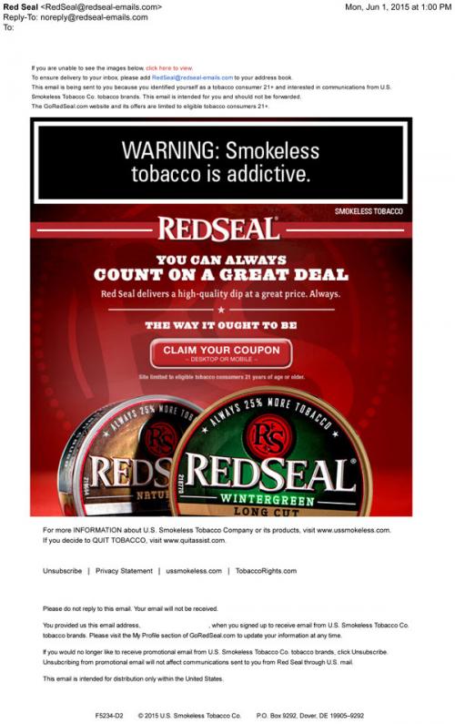 Red Seal email from June 2015 inviting the recipient to the brand website to claim their coupon, via desktop or mobile phone. Imagery features their wintergreen long cut product. Text: "You can always count on a great deal."