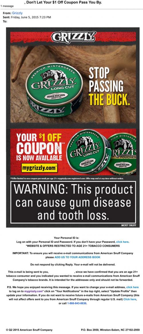 Email from Grizzly in June 2015 with a reminder to the recipient, "Don't let your 1$ off coupon pass you by." Includes a link to the brand website to claim the coupon. Text: "Stop passing the buck."