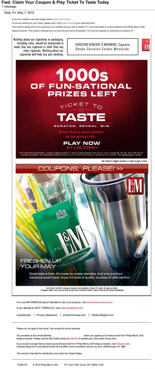L&M promoted their Ticket to Taste sweepstakes by email in May 2015: "Every day is your chance to be winner-ific." They also provide a link to the brand website to claim coupons. The main product featured is their menthol cigarette.