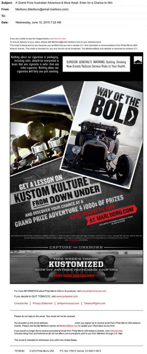 Way of the Bold email update from Marlboro in June 2015. The recipient is invited to the brand website to explore "Kustom Kulture from Down Under," as well as to enter to win prizes. The weekly photo theme is "Kustomized," which is a tie-in to the sweepstakes.