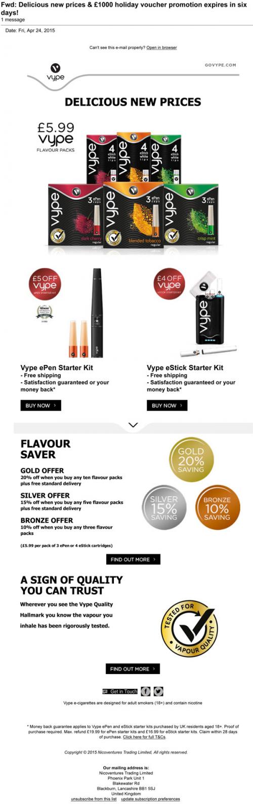 Vype email promotion in April 2015 about their "delicious new prices." Emphasizes their "Flavor Saver" deals, where increased number of packs purchased means increased savings.