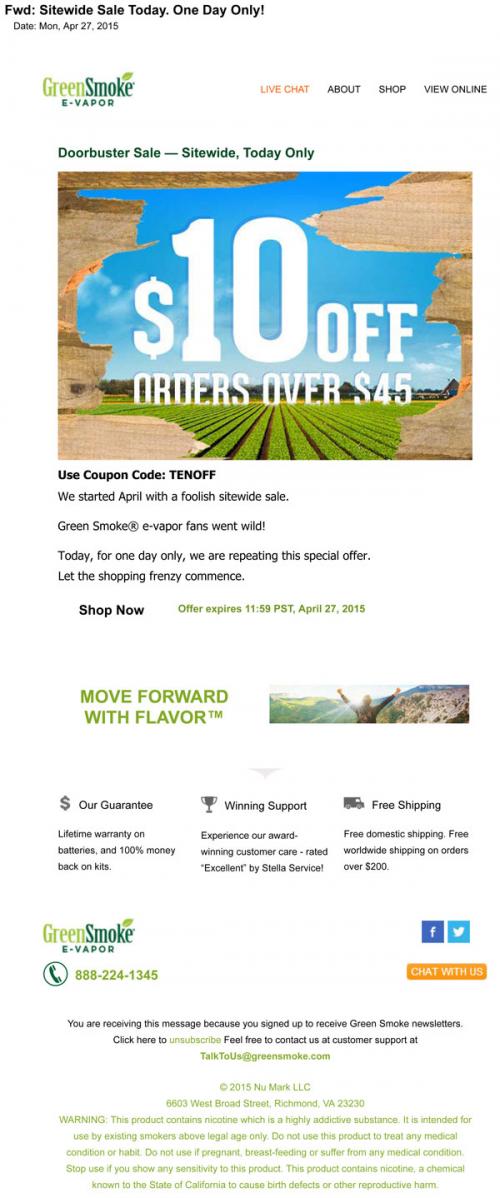 GreenSmoke sent an email in April 2015 announcing a site-wide sale, where customers could get 10$ off their 45$ purchase. Text: "Let the shopping frenzy commence."
