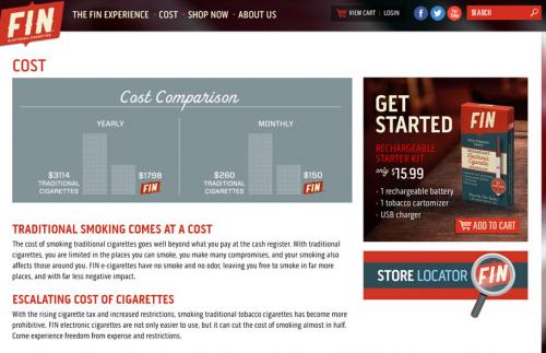 A screenshot from the Fin brand website originally accessed on January 31, 2015. Fin promotes their products as "freedom from expense and restrictions," showing the comparison in prices between traditional cigarettes and their e-cigarettes, as well as mentioning the lack of smoke and odor, "leaving you free to smoke in far more places, and with far less negative impact."