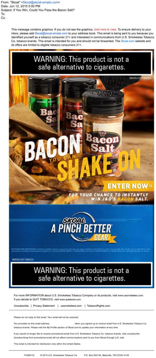 Skoal email in June 2015 promoting a chance to win some bacon salt on the brand website, as part of their Gear sweepstakes.