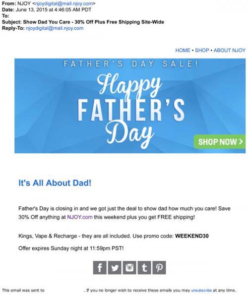 NJOY emailed a weekend discount code in June 2015 as part of their Father's Day sale, applicable towards any purchase on their brand website.