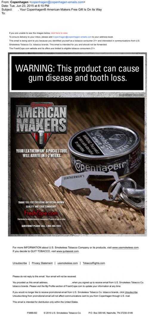 Copenhagen email in June 2015 informing the recipient that their free gift to promote the American Makers sweepstakes, a Leatherman pocket tool, has shipped.