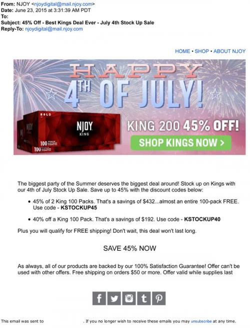 4th of July discount codes for King cartridge pack savings from NJOY, sent by email in June 2015.