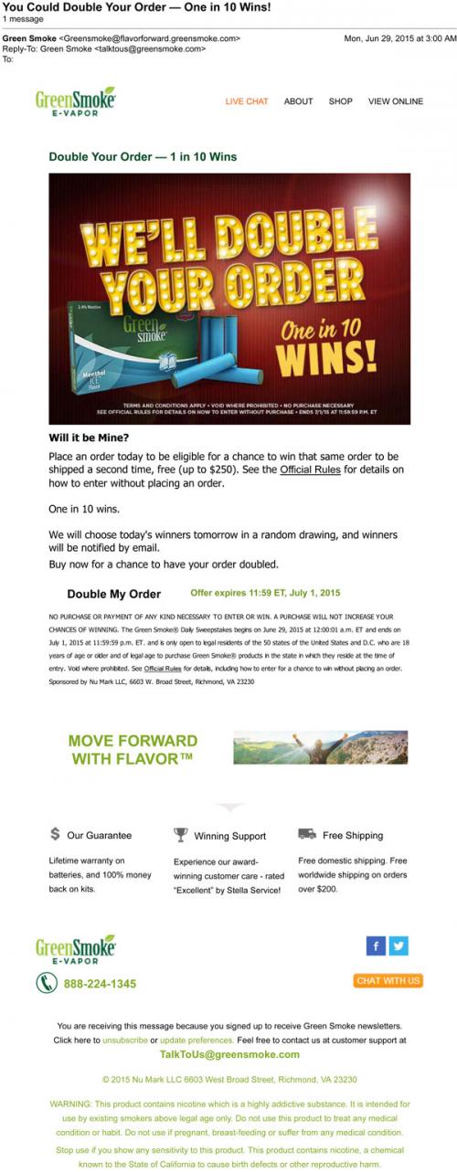 Green Smoke email in June 2015 promoting a sweepstakes where customers can win a duplicate order for free.