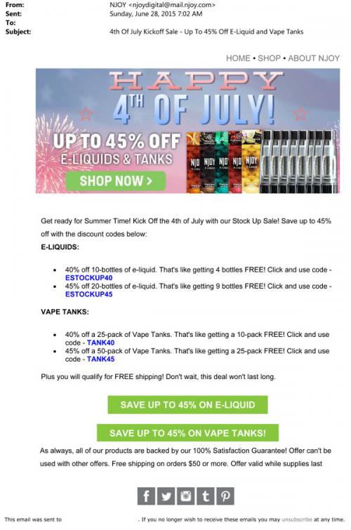 NJOY invites the recipient of this email to "get ready for Summer Time" with discount codes for e-liquids and vape tanks on their brand website, as part of their July 4th sale in 2015.