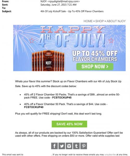 NJOY asks "Whats your flavor this summer?" in this email promoting discount codes for flavor chambers on their brand website, as part of the July 4th sale in 2015.