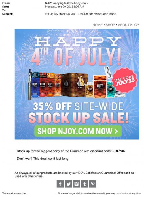 NJOY promoting their July 4th sale with an email containing a discount code for 35% off any purchase on the brand website, sent in June 2015.