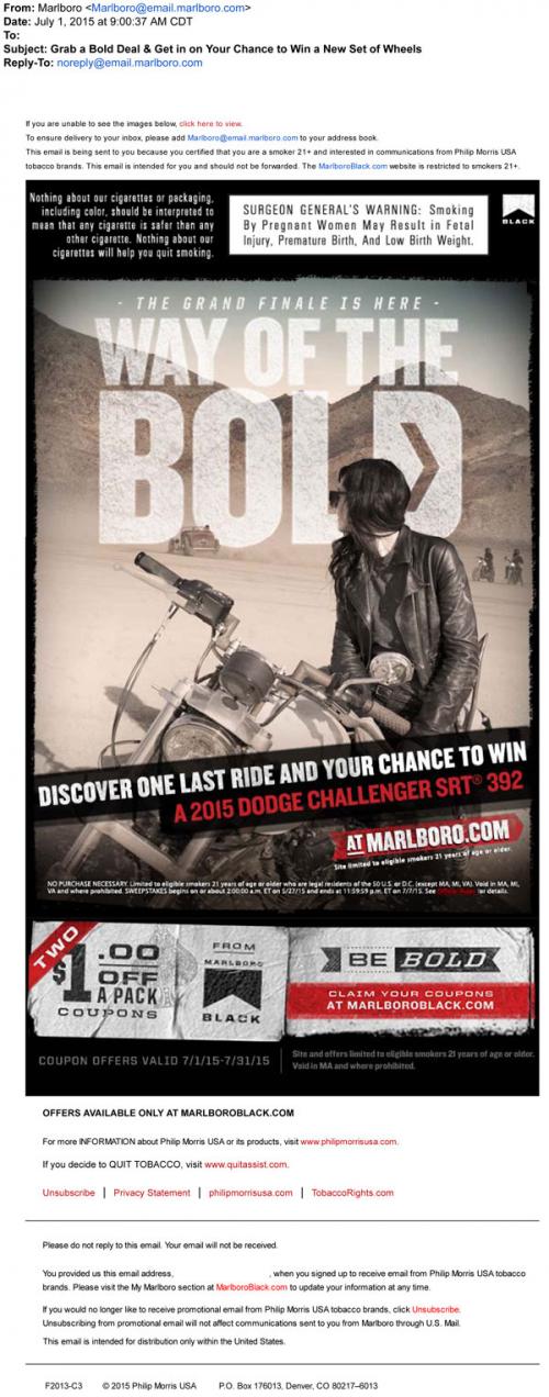 Marlboro email in July 2015 promoting the final week of the Way of the Bold sweepstakes. Email includes an invitation to the brand website to participate and claim coupons.
