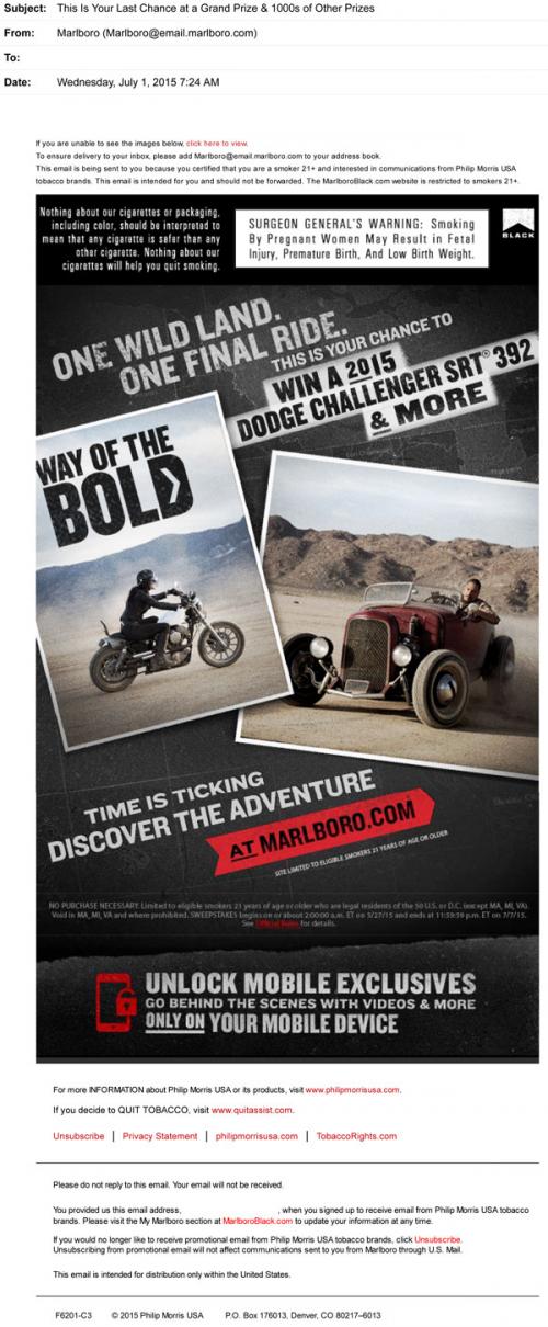 Email reminder from Marlboro in July 2015 of the last chance to enter in the Way of the Bold sweepstakes. Also includes an invitation to see behind the scenes footage on the brand website, with exclusive access via a mobile phone or other device.
