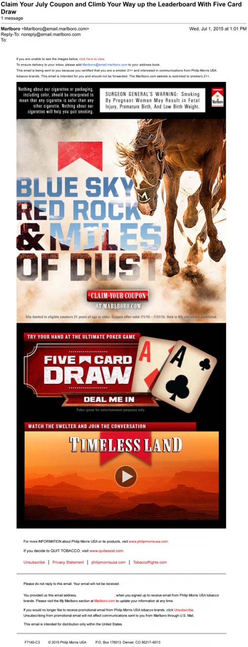 Marlboro email from July 2015 with an invitation to claim a coupon at the brand website, play a game of poker with their Five Card Draw game, and watch the new featured video Timeless Land.