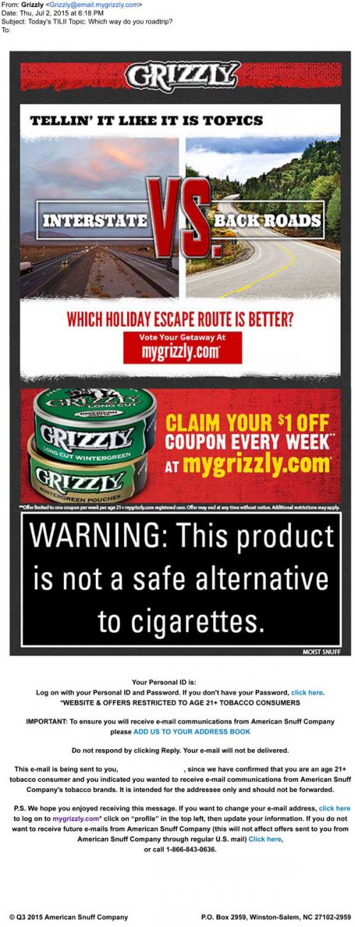 Email from Grizzly in July 2015 inviting the recipient to the brand website to claim a coupon and discuss the weekly "Tellin' it like it is" topic, "Which holiday escape route is better?"