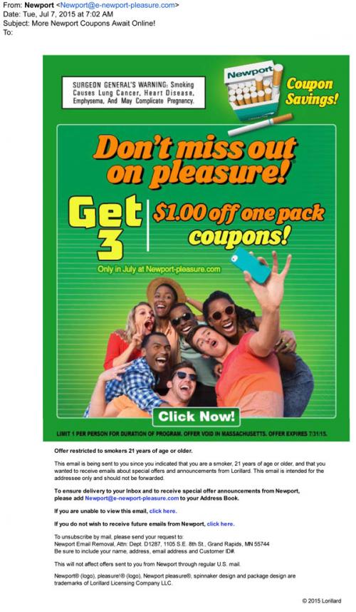 Newport email from July 2015 promoting a special monthly coupon offer where visitors to the brand website can get three 1$ off a pack coupons. Image includes a bunch of happy people taking a group selfie with a mobile phone.