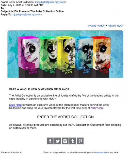 NJOY email promoting the Artist Collection, a selection of flavored e-liquids created by "leading artists in the vape industry." The liquids are now available to buy on the brand website.