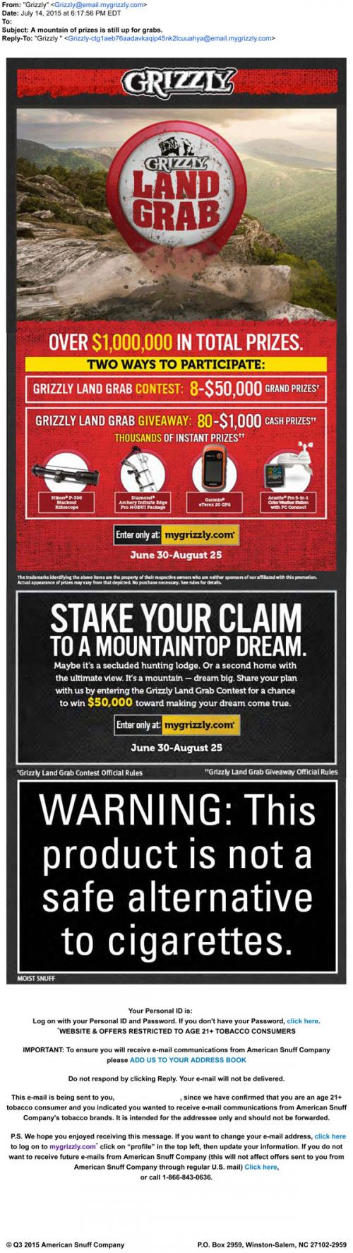 Reminder email from Grizzly in July 2015 to log into the brand website and participate in the Land Grab sweepstakes to win 50,000$ or instant prizes. Includes an animated GIF.