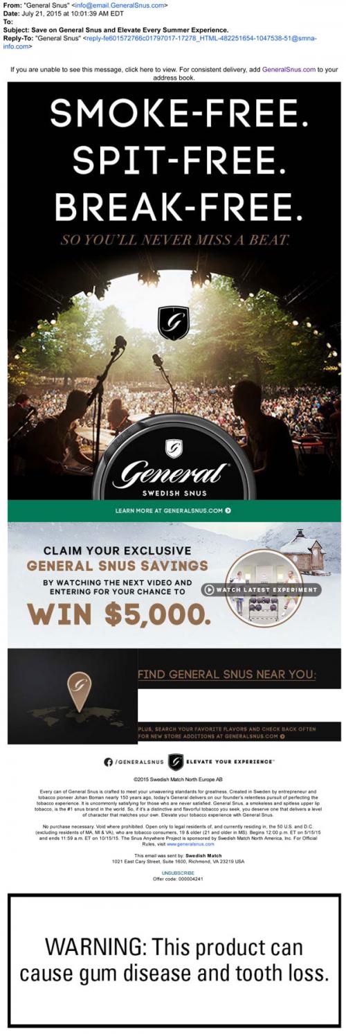 General Snus email in July 2015 promoting their product as "Smoke-free. Spite-free. Break-free. So you'll never miss a beat." The accompanying image is of a rock festival or concert, implying the benefits of using their products over cigarettes at one of these events. Also invites the recipient to the brand website to participate in the Snus Anywhere contest and to find nearby retail locations.