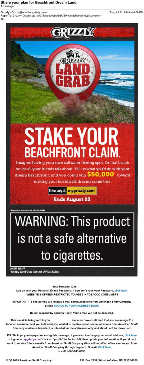 An invitation via email from Grizzly in July 2015 to visit the brand website and "stake your beachfront claim" as part of the ongoing Land Grab contest. Includes an animated feature.
