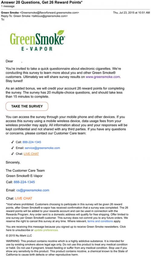 Green Smoke sent out a survey by email in July 2015, looking to know their customers a little better. The survey included questions about e-cig use and comparisons between Green Smoke products and other brands. As a reward for taking the survey, customer accounts will be credited with 26 reward points, which can be exchanged for products in the brand website store.