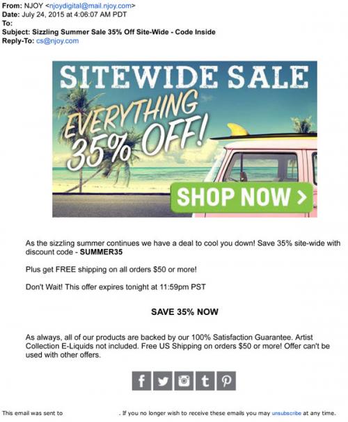 NJOY email with discount code applicable to any purchase on the brand website, sent July 2015. Image shows a beach with palm trees and a vehicle with a surf board on the roof. Text: "As the sizzling summer continues we have a deal to cool you down!"