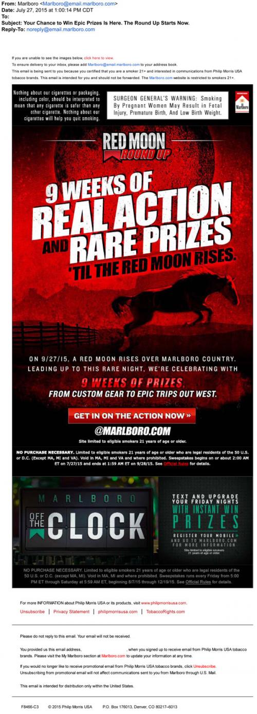 Marlboro email sent in July 2015 announcing the start of two new sweepstakes on the brand website. One, the Red Moon Round Up, requires the visitor to watch a video and answer a question to be entered to win a weekly prize. Off the Clock requires a mobile text entry on Friday nights from 5pm to 6am, although there is a way to enter on the brand website without the use of a mobile phone.