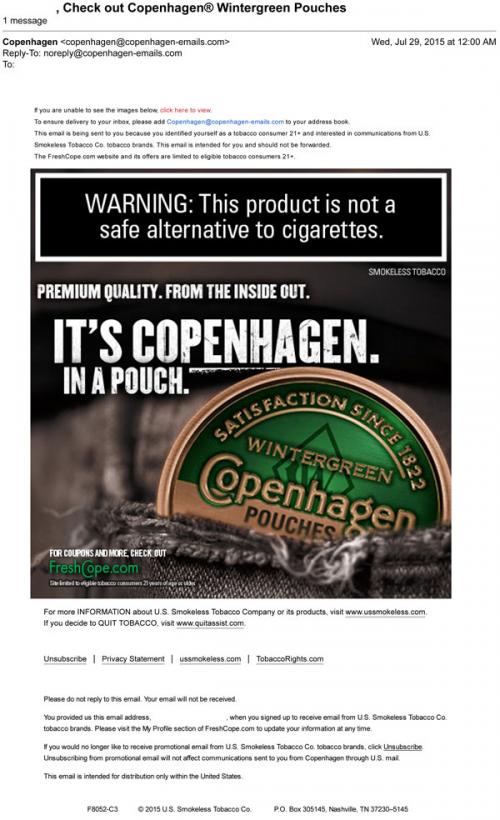Copenhagen email in July 2015 promoting their Wintergreen tobacco in pouches. Links to the brand website to claim coupons.