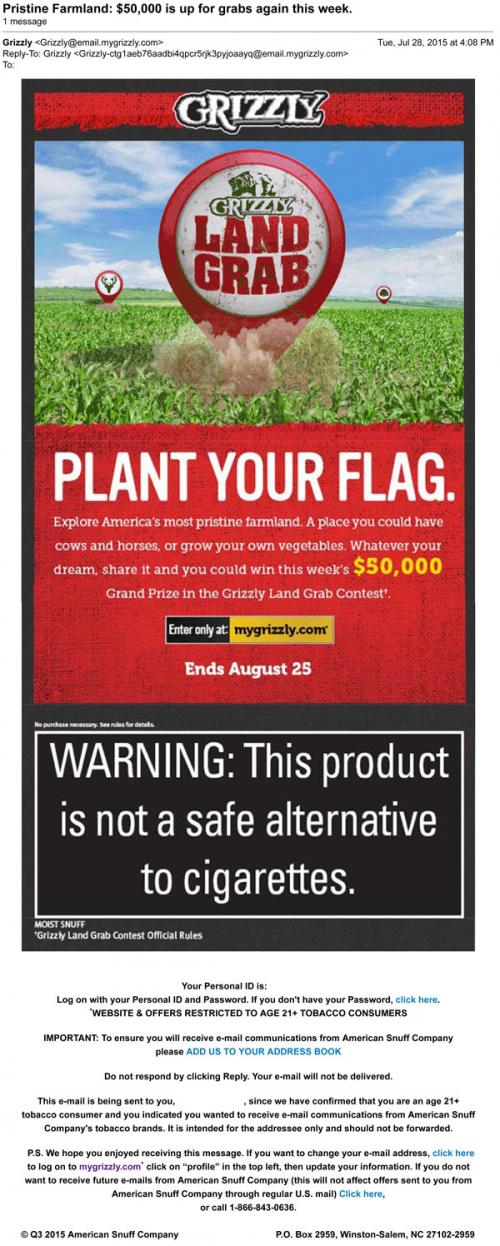 Email from Grizzly in July 2015 inviting the recipient to "Plant Your Flag" and participate in the recent round of the Land Grab sweepstakes.