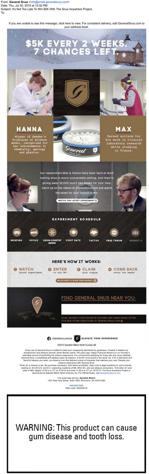 Email from General Snus in July 2015 promoting their Snus Anywhere sweepstakes on the brand website. Includes links to the brand website to watch the video and enter the contest, as well as a store locator. Features animated GIFs.