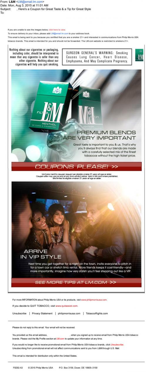 Email from L&M in August 2015 promoting the premium blends of their products. Also invites the recipient to check out nightlife tips and claim coupons at the brand website.